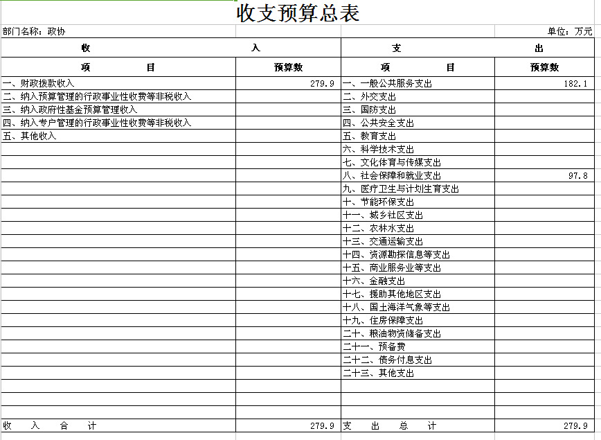 按照综合预算的原则,喀左县政协所有收入和支出均纳入部门预算管理。收入是财政拨款收入;支出是一般公共服务支出、社会保障和就业支出等。喀左县政协2016年收支总预算279.9万元。