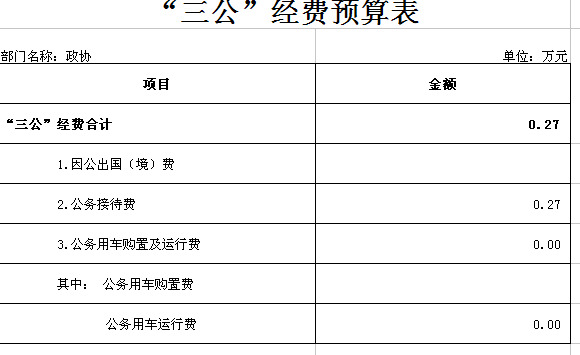 按照中央及省委、省政府关于厉行节约、改进工作作风、密切联系群众中央八项规定等有关要求,严格控制“三公”经费支出,压减公务接待费和公务用车购置及运行费。其中:公务接待费0.27万元;公务用车购置及运行费0.00万元。与上年基本持平
