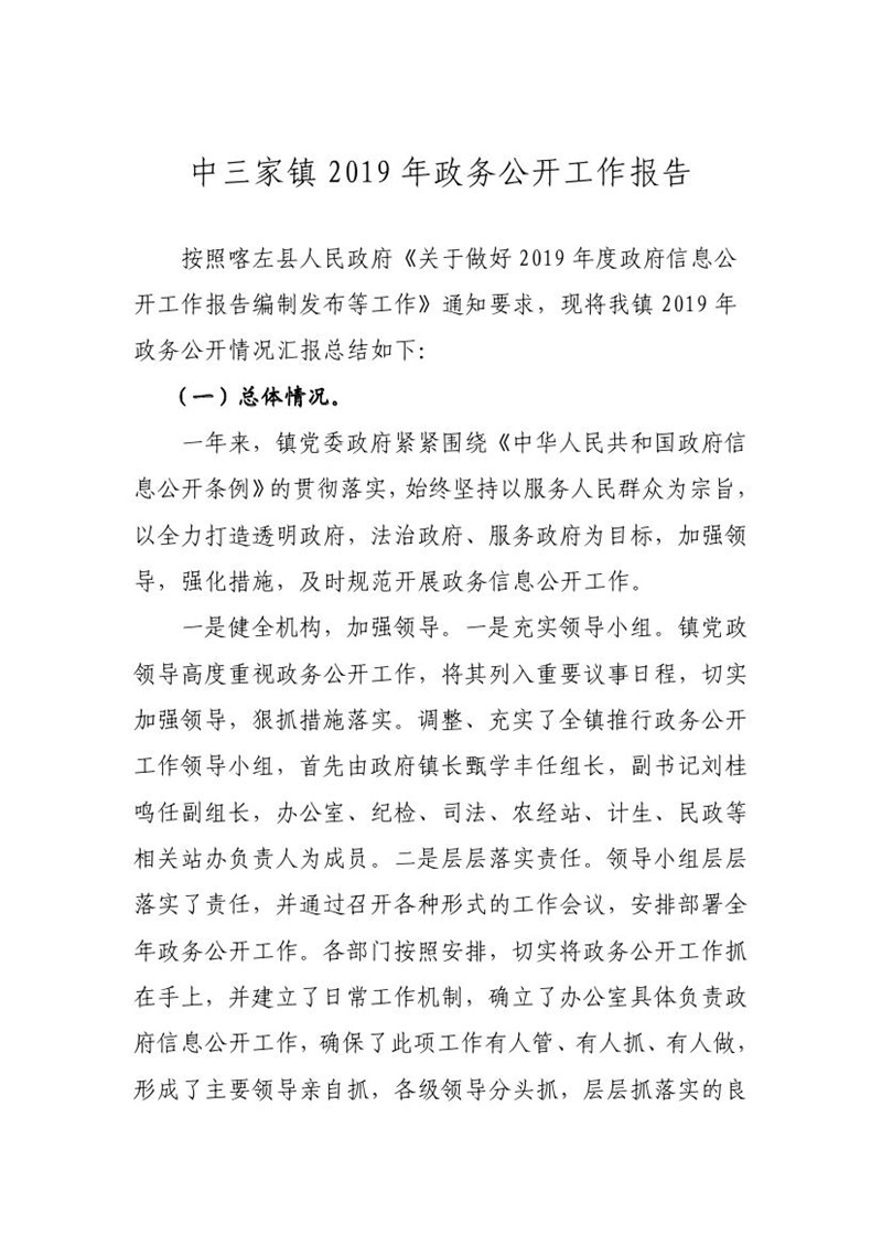 中三家镇2019年政府信息公开年度报告