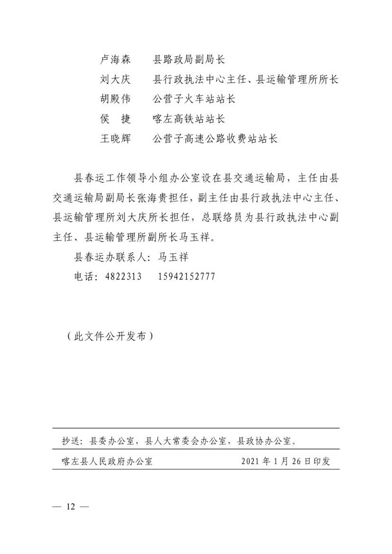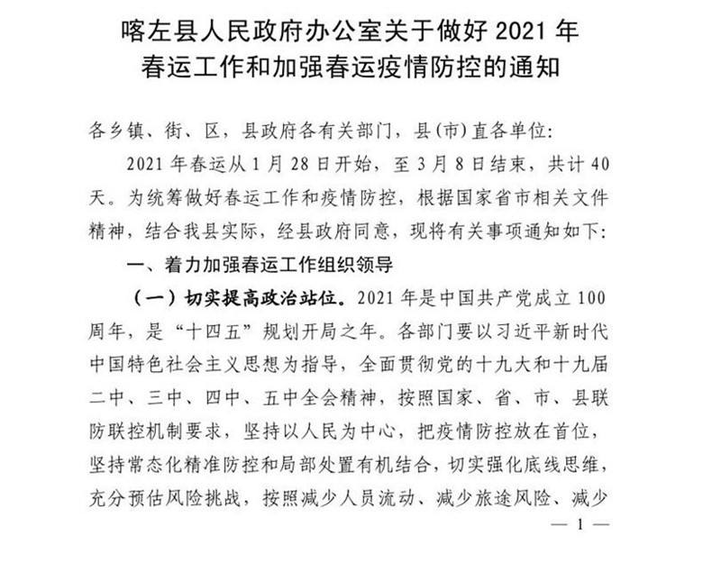 喀左县人民政府办公室关于做好2021年春运工作和加强春运疫情防控的通知