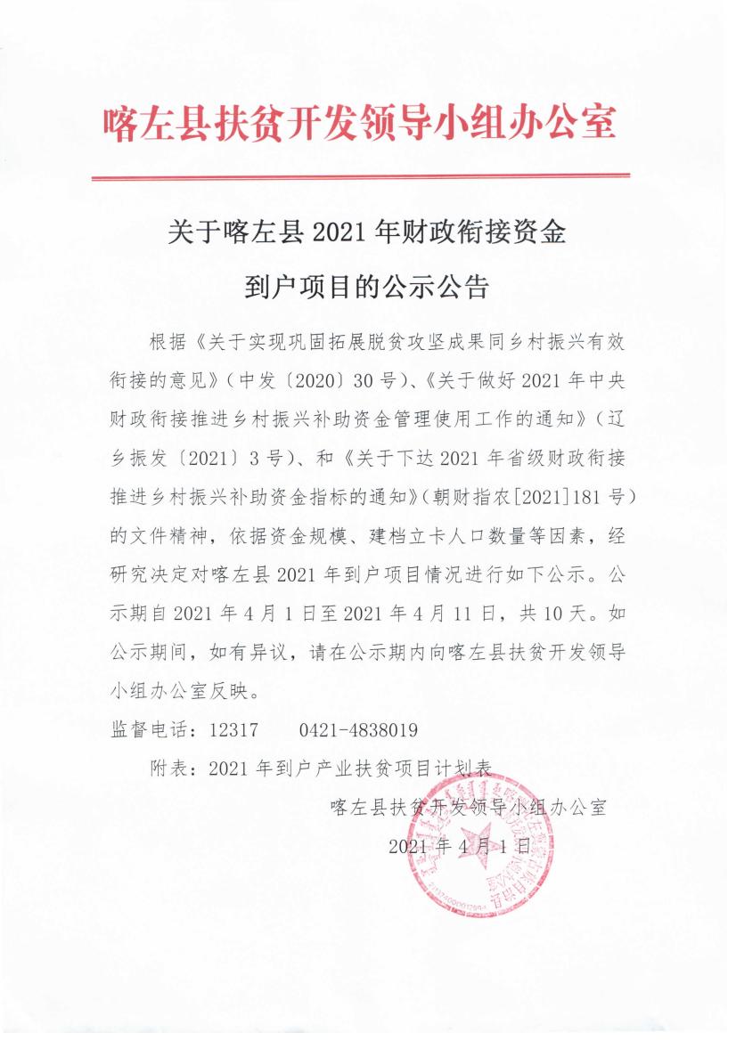 关于喀左县2021年财政衔接资金到户项目的公示公告