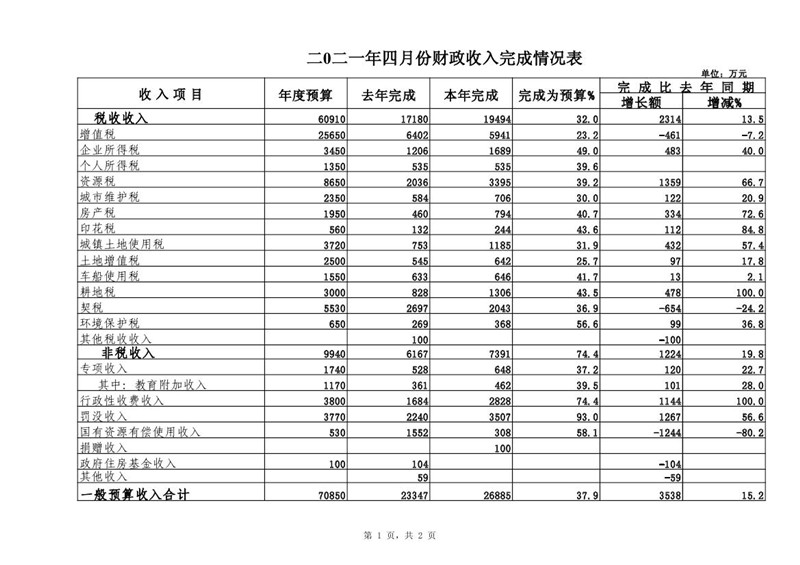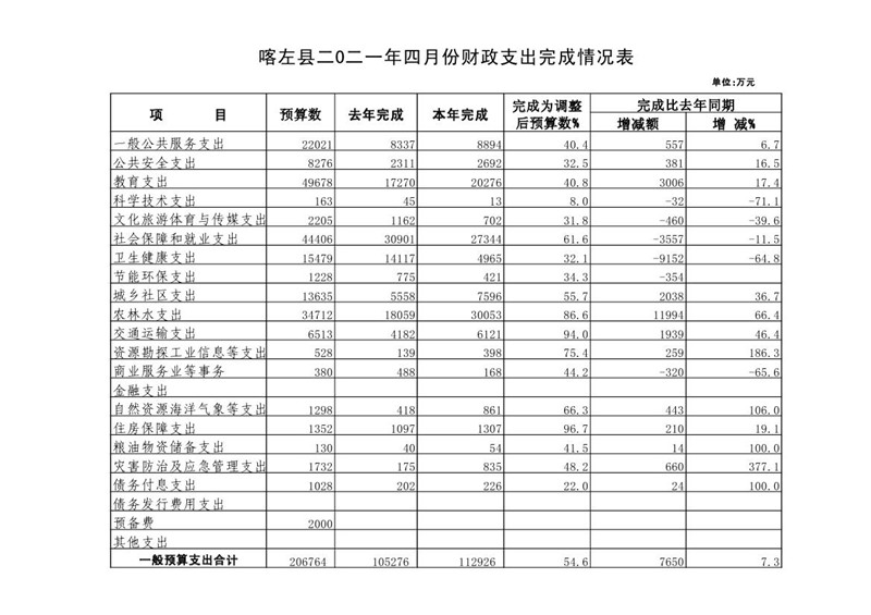 喀左县2021年4月财政预算执行情况