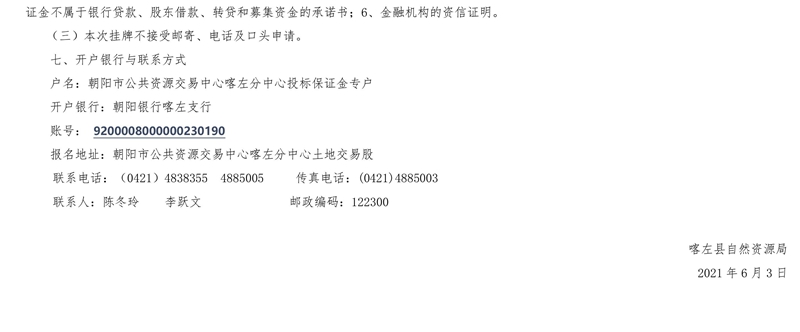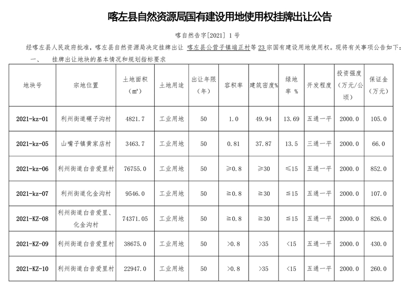 喀左县国有建设用地使用权挂牌出让公告 喀自然告字[2021] 1号