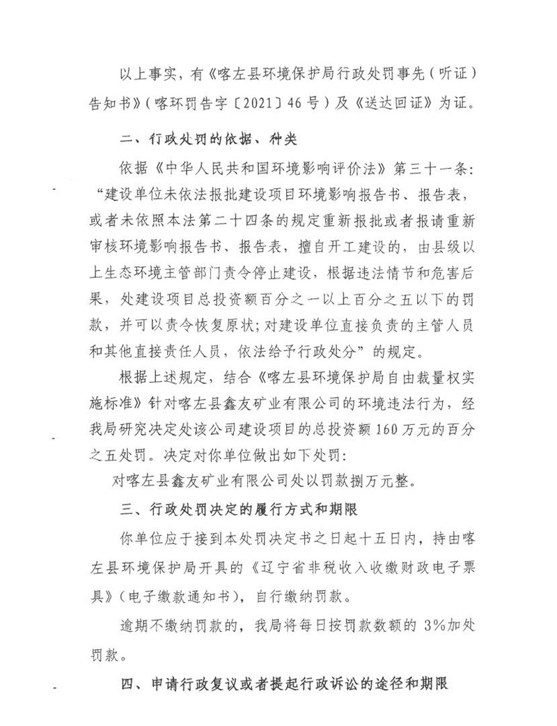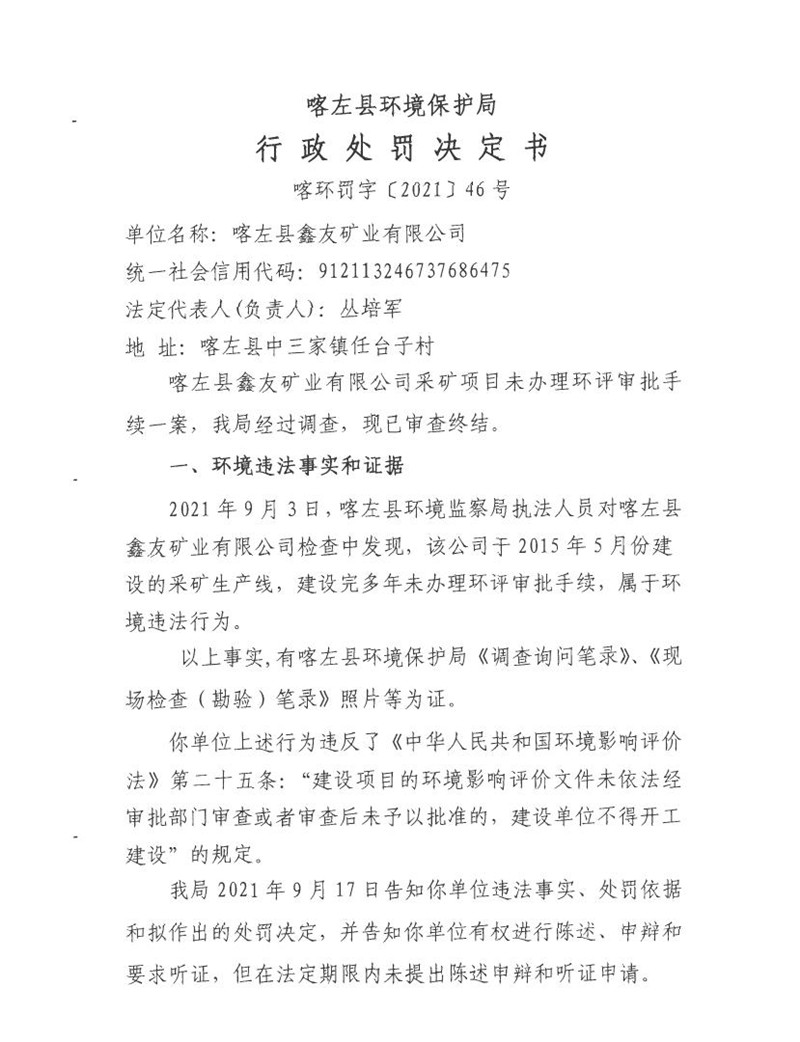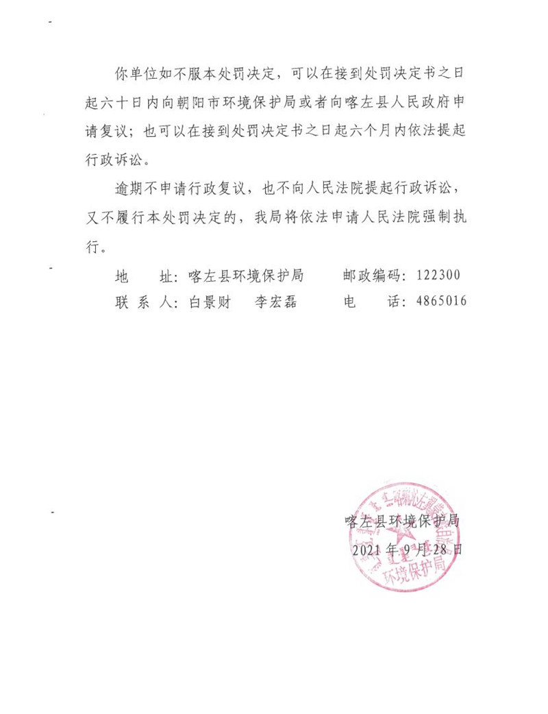 喀左县环境保护局行政处罚决定书 喀环罚字〔2021〕46号