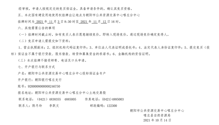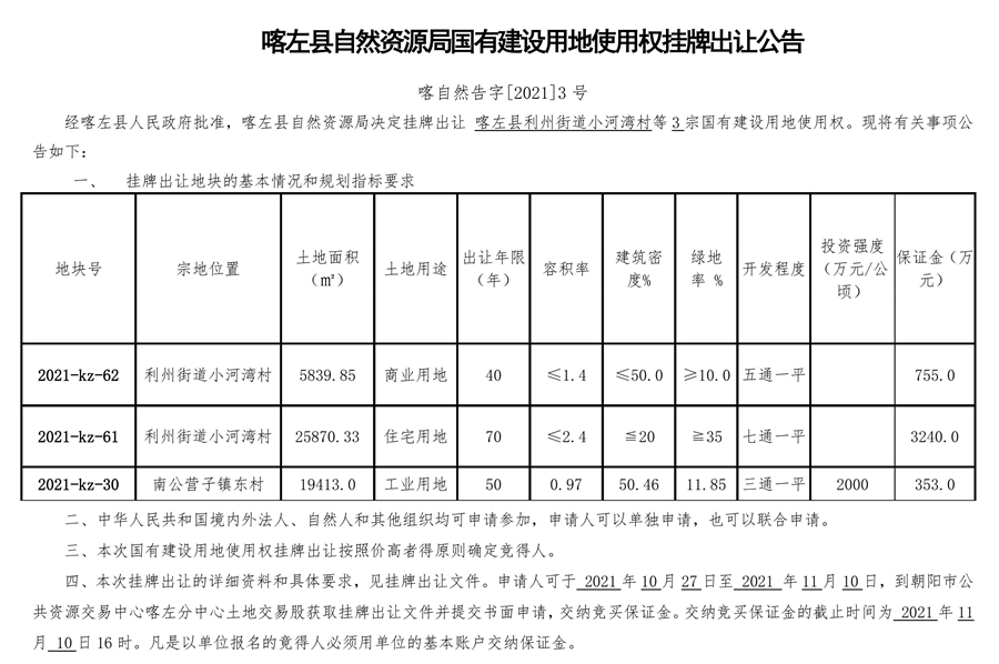 喀左县自然资源局国有建设用地使用权挂牌出让公告 喀自然告字[2021]3号