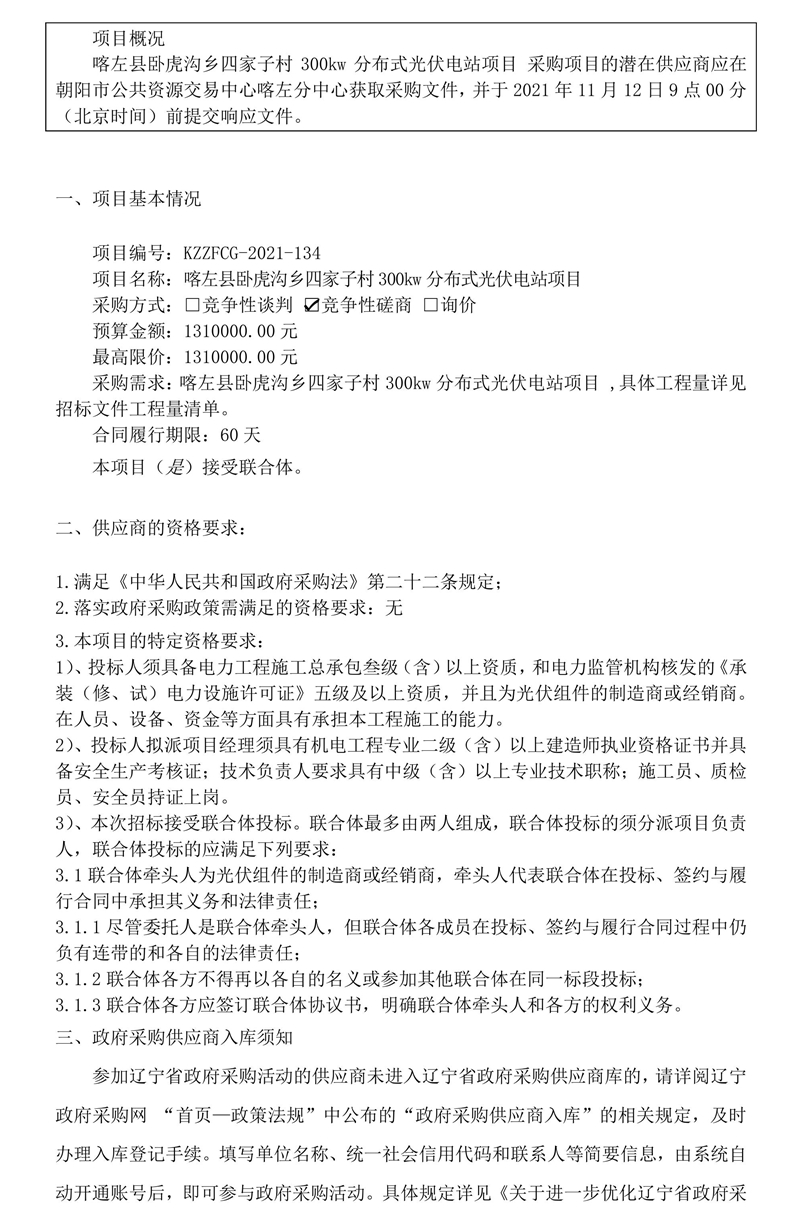 喀左县卧虎沟乡四家子村300kw分布式光伏电站项目竞争性磋商公告
